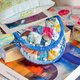 The cat is cross stitched with DMC floss on 32 ct fabric with petite stitches (1-over-1), which means tiny stitches.