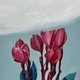 花苞较为饱满密集,构图集中于花朵本身,红色花苞更加饱和,背景则为更柔和的天青色与白色,营造出晨曦或云层笼罩下的微光感,整体氛围更为凝聚与集中。