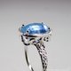 这款戒指将清爽蓝色的海蓝宝石,镶嵌于唐草与缕空雕花的台座上。