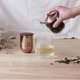 不同于常见的紫砂壶,WEAVER小壶泡茶组的设计,以富有现代感的耐热玻璃为材质。一组含小壶、茶杯、滤茶器三件,使用方式为将茶叶平铺于小壶的壶底、加入热水,透过红铜滤茶器过滤至玻璃杯中;重复五到六次,直到杯中茶汤约为八分满。如此放慢的“Slow tea”泡茶动作,能够让茶叶能有足够的时间与空间舒展,并释放出最完美的茶汤滋味。