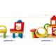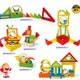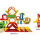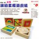 以五款几何图形制作不同大小的正方框、三角积木、三角框、圆弧、圆形、长方积木、长方框等,让儿童可以运用套框中空的特性将积木互相搭配,建构组合名种充满创意的造型, 过程中可培养儿童的空问建构能力与精细动作。