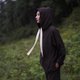 - 深棕色的亚麻交织出自然的老式机织布纹理,特别的织法让面料展示出丰富的色彩层次,衣身廓形宽松流畅。