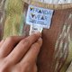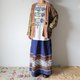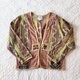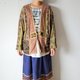 男女皆适穿的中性80年代危地马拉依卡(Ikat)织布外套, Ikat 依卡织是先染布,顾名思义,就是纱线在织布前,会以不同染料直接染出带有花纹的色块,接着才进行织布,完成品带着有如网点般的特殊渐层图腾。下摆则拼接源自非洲的泥染布料(黑白色) ,另一个细节在鸟形的立体扣,充满大地色泽与自然意象。