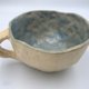 尺寸:11 x 8.6 x 5 cm。 使用台湾白陶土、美国Amaco釉药。 内侧为蓝色釉药,外侧为砂白色釉药。 圆胖宽口造型,小巧好拿。 背后有刻上“扭扭陶”字样。 使用回收再利用之包材。