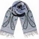 ▲喀什米尔靠近喜马拉雅山,为了对抗特殊的酷寒气候,水煮羊毛是喀什米尔利用当地自然环境发展出来的一种细致的工艺, 当地海拔高,水的沸点低,早晨在太阳上升时,将羊毛制品,放入融化的高原雪水中浸泡,之后加热沸煮。到了傍晚太阳下山时,再把羊毛制品在月光下晒,经由繁复工续后的产品, 不但可以清除掉一些杂质,羊毛产生收缩,纤维之间更加地紧密,最后经由妇女手工编织及刺绣,呈现一件件颜色及绣法独特的织品