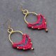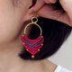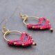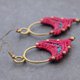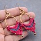 这是用蓝色和粉红色的棉花编织的手工编织耳环与黄铜珠编织在一起。耳环挂在天然黄铜耳在线