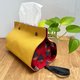 侧面缝制真皮挂带,可摆桌上、吊车上或洗手间,适用一般市售卫生纸。平放时还可当餐垫。小盒装面纸可以不放入内里,直接包覆扣上扣子使用。