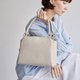 采用轻盈且柔韧皮革制成展现手工温暖的质感。不使用金属配件透过皮革环扣连接手柄与包身成为低调的点缀,同时展现无缝的一体感设计。