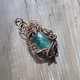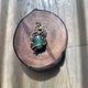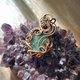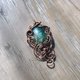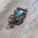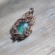 绿草莓晶(东陵石)吊坠。线材为纯铜线仿旧处理。整体尺寸(长x宽)为41x23mm。