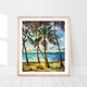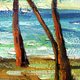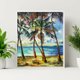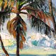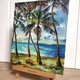 Original hand-painted small oil artwork created by the artist Kseniya Sviridova. Bright beach painting with palm trees at sunny day. Artwork created by me in December 2021. One of a kind painting, no print or copy!