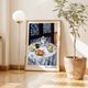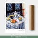作品以浓烈深蓝与白瓷对比,辅以活泼的黄、橘、绿点缀,呈现出平凡生活中最细腻的情绪光影。窗外的蓝花窗纹呼应壁纸图腾,将观看者带入一段如诗般的静谧时光。无论你将它摆在餐桌、客厅或阅读角,都能唤起一种优雅的生活仪式感。