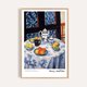 午后的阳光洒落,桌上一壶蓝白瓷茶具与盛满柑橘的果盘,共谱一场色彩与生活的诗意对话 —《午后的蓝瓷时光 Blue Porcelain Afternoon》是一幅向法国现代艺术巨擘马谛斯(Henri Matisse)致敬的现代插画,以其大胆而纯粹的色块语言,展现静物画中的动人氛围。