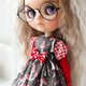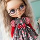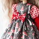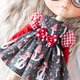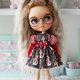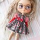 Dress for Blythe dolls is made of cotton with mushroom motifs, fly-over print. The dress is sewn by hand. The dress is made of five different kinds of fabrics, there is a mesh underneath. The dress has a clasp at the back.