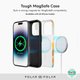 为了不影响外观又可兼容MagSafe,我们将强力磁粒内藏于硬壳里,能兼容具MagSafe配件如MagSafe充电器、MagSafe Wallet、MagSafe Car Mount、MagSafe支架等。双层防摔Mag+手机壳也可以定制加名啊。