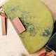 |尺寸 13.5*9cm|颜色 黄色包身透出蓝色不规则斑纹 淡绿色拉链|材质 羊皮 铜质拉链 植鞣牛皮手把
