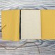 这本手工编织民族风刺绣笔记本,采用蜡感棉线(蓝色与薄荷绿)手工缝制,封面可拆卸,配有魔鬼毡黏条,封面材质为麂皮(鸭绿色)。另外还附有一条芥末黄色细绒绳。