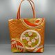 这是一款优雅的包,采用美丽的橙和绣有蝴蝶和花痴的金色腰带。
