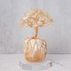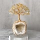 “聚宝盆-永生水晶树”是以黄水晶与晶洞结合注金工艺线编制而成。底部使用缠绕的方式包裹着晶洞,展现出根系生长的姿态,顺着枝干向上攀升的过程,逐渐展现出花木的生长方式,结上一颗颗的黄水晶,犹如枝叶绽放,绚丽而生动。