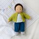 这款经典华德福娃娃男孩,拥有健康肤色和绿色眼睛,高约 12 英寸 (30 厘米)。采用环保材质制作:娃娃身体使用 De Witte Engel 欧盟环保认证棉质针织布,眼睛和嘴巴以绣线刺绣。头发使用马海毛粗纺纱线。身体和头部填充 100% 有机羊毛。脸颊颜色使用蜂蜡蜡笔绘制。娃娃仅能倚靠支撑才能坐立。