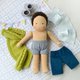 此娃娃穿着棉质针织内裤、棉质针织 T 恤、棉裤、针织棉质开襟毛衣和钩针编织靴子。
