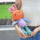 - 和你的臂弯完美契合的抱抱兔子,此为拼色版本,每个部位都有各自颜色的设计,像是六、七十年代时期,家长尽量利用家中的剩余材料为孩子制作出来的玩偶,充满怀旧气息。图解针法以短针为主,只要认真跟从图解的指引和老师在影片中的示范,就能顺利完成。