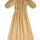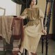 - 駝色全棉 褶皺花邊小方領+松緊束腰 立體燈籠袖造型 復古少女單品