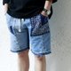 于牛仔短裤之上拼上不同深浅的牛仔布及Bandana,备有红色及蓝色Bandana选择。