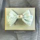 淡湖水绿的缎带铺上似雪的蕾丝,交叠出如冰晶般的色调,白玫瑰与金叶上的晨露站方出冬日耀眼的花颜。 约12cm X 6cm 使用施华洛水钻