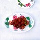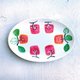 A rose pink oval plate with a humorously deformed persimmon design.