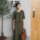 上衣V领,显瘦,连体中袖设计,高腰裤,显瘦,腰头细节设计很用心,暗扣,加裤钩,