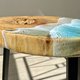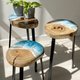 This piece is hand-painted with epoxy resin on a live-edge wood slice. It consists of 2 layers of resin and is finished with wood wax to protect the wood piece. Steel legs are coated in a matt black paint finish.