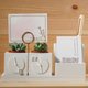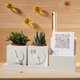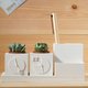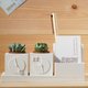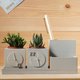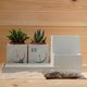 可收纳文具及多肉盆栽,右边高筒可收纳办公室需使用到的各式文具(如笔、尺、剪刀);右边低筒可收纳名片、门禁卡等;左边底座可摆放2个1寸多肉植物水泥盆栽,亦可做为公仔展示台。