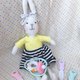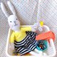 Rabbit Doll 03 is a rabbit doll with a removable set. Consisting of a pastel yellow shirt dress made from fabric of a slope with a chic striped skirt And comes with striped shoes Same pattern as the skirt Rabbits have pink cheeks. Washable Has a height of about 30 cm.