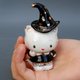这个Kitty陶瓷雕像是我做的。手工制作的小瓷雕像。可爱的小猫小猫以女巫(或观星者)的形式出现。穿着白领黑色连衣裙,戴着带有金色星星的精美帽子 送给猫奴、收藏家的绝妙礼物,适合任何场合,带来好心情。单份。 高度 9 厘米