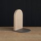 原革书档造型联想于台湾老砖房拱门,一种现代建筑遗失的房门曲条,搭配在方正的书丛中,增添一丝柔和。 皮革底面搭配实木,一柔一刚的材质,质感、细节提升外,同时能达到保护台面、止滑等细节要求。