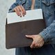 这款皮革笔记本电脑保护套采用纯手工打造,选用复古干邑色真皮,优雅精致,能够可靠地保护您的设备免受刮擦、灰尘和轻微碰撞。保护套内衬采用毛毡和织物材质,并设有一个内袋,方便存放充电器、数据线或小型配件等必需品。