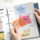 **◎票券收纳页 (8张入):**每格透明PP膜收纳格大小为15x8cm,收纳格旁还可书写记录,可收纳各式发票、收据、票根...等等,旁还可书写记录。