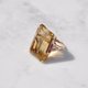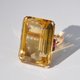 这只鸡尾酒戒的中间镶嵌着一颗42.3克拉祖母绿琢型的黄水晶,戒子的两侧分别镶嵌着三颗垂直排列的法式切工红宝石,戒子的侧边是简洁的线条式雕工,整只戒子充分了展现了装饰主义的简洁却又带着几何图案的设计。