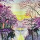 这幅画诞生于清晨,阿传说那是一天最珍贵的时刻。夜色尚未全退,天边却已透出一抹光,将河岸两旁盛放的花树染成梦幻的紫红色。水面映照着初升的日轮,仿佛提醒人们:即使黑暗曾经笼罩,总会有光明再次到来。