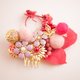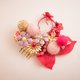 头饰以金色铁线人手编织。严格挑选精美素材如仿珍珠,古董帽叶、合金花片、玉石等