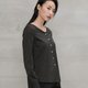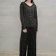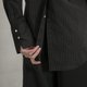 棱角分明的条纹上衣,俐落的V领线条刻划着硬颈精神;前后衣长刻意的落差、过长的精致衬衫袖,后片门襟可利用暗扣调整开衩长度。不同部位的设计彼此互相呼应,仿佛整装待发般的坚毅果敢,散发着不容动摇的自信神采。