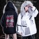 连帽带有一圈可拆毛领装饰,金属装饰大部分不可拆