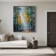 画面以森林为主题,光线从枝叶之间穿透而下,形成层叠的金与蓝,映照出秋日午后那种带有柔雾的空气感。艺术家以厚薄并行的笔触,使颜料在画布上留下时间的痕迹,展现出自然光与空间节奏之间的对话。