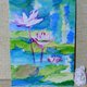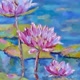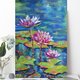 用荷花绘画。粉红色的睡莲画在画布上。原创花艺。池塘油画艺术品。