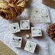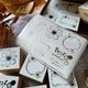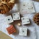 花花套章:5颗。 压缩木+红橡皮,单颗均为3x3cm。 牛皮纸盒+印章同款烫金贴纸。 美日手艺承制