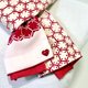 这件作品,是以红色为底、点缀无数白色六角花朵的布料搭配米白底、红色六角花朵的布料,营造出跳色的视觉撞色效果。