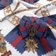 整体构图呈现戏剧性的海军蓝缎带蝴蝶结、华丽的奖章、装饰性链条,以及徽章般的图腾,以平衡对称的布局巧妙排列。
