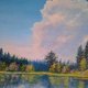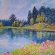 湖畔田园诗般的晴朗夏日,前景是鲜艳的粉红色花朵,背景是森林,天空中有一朵巨大美丽的白云。以浪漫写实风格绘制。
