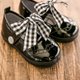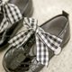 鞋面材质:人造皮革 / 可拆卸式黑格子缎带蝴蝶结。