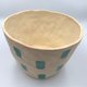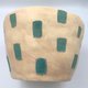 尺寸:15 x 14.5 x 10 cm。 使用台湾白陶土、美国Amaco釉药。 上宽下窄之小陶盆,适合种植多肉植物或室内景观植物。 外侧表面为蓝绿色方块图案彩绘,并有粉色透明流动纹样。背后刻有“扭扭陶”字样。 使用回收再利用之包材。